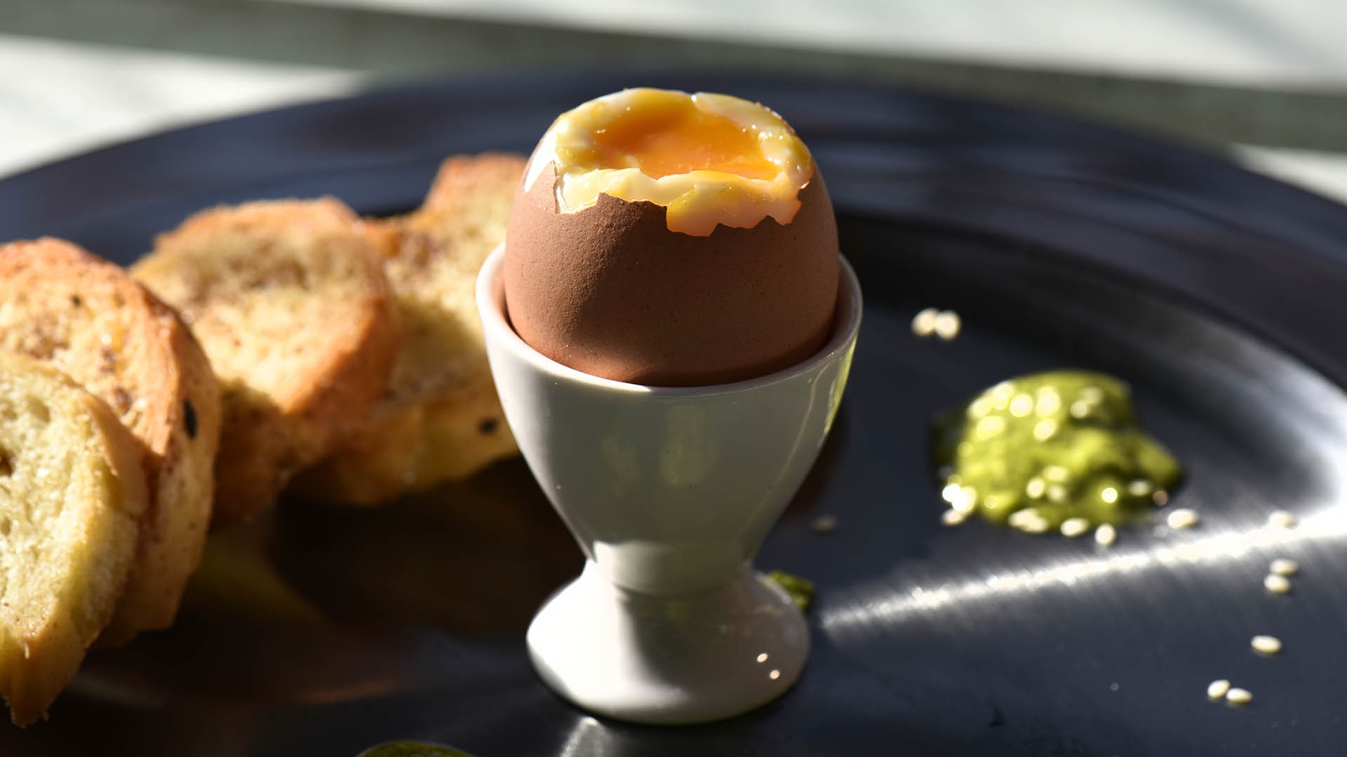 En una olla cocinar los huevos a partir de agua fría, cuando el agua empiece a hervir dejarlos por 3 minutos. Luego ponerlo en un posa huevos y con un cuchillo comenzar a romper la cáscara de la parte de arriba del huevo hasta que se empiece a ver la yema. Luego, agregarle un poco de sal y un poco de la salsa de cilantro.